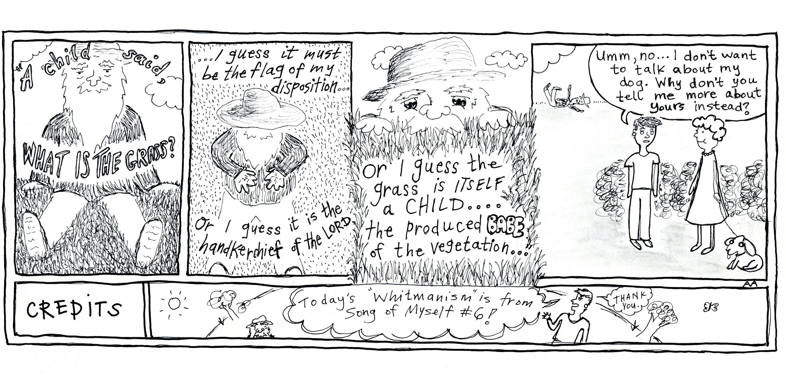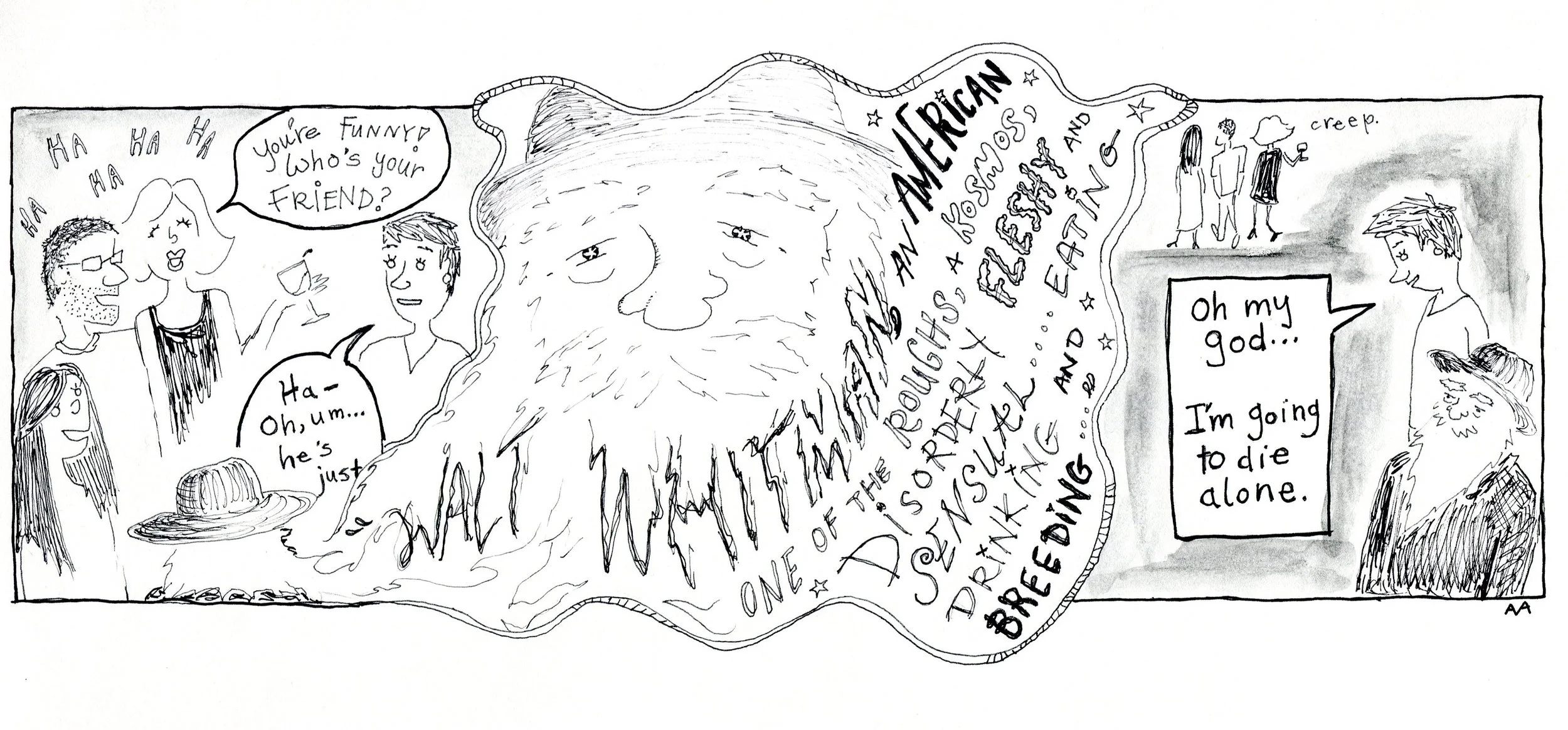I chose to write a comic about Walt Whitman as my... let's say indecorous, free-spirited housemate. My favorite part about it was that all of his lines came from his long-ass series of poems, “Song of Myself” (technically, it’s one long poem, but we can talk about that another time—actually, we can talk about "Song of Myself," 19-century America, transcendentalism, and other fun stuff another time).