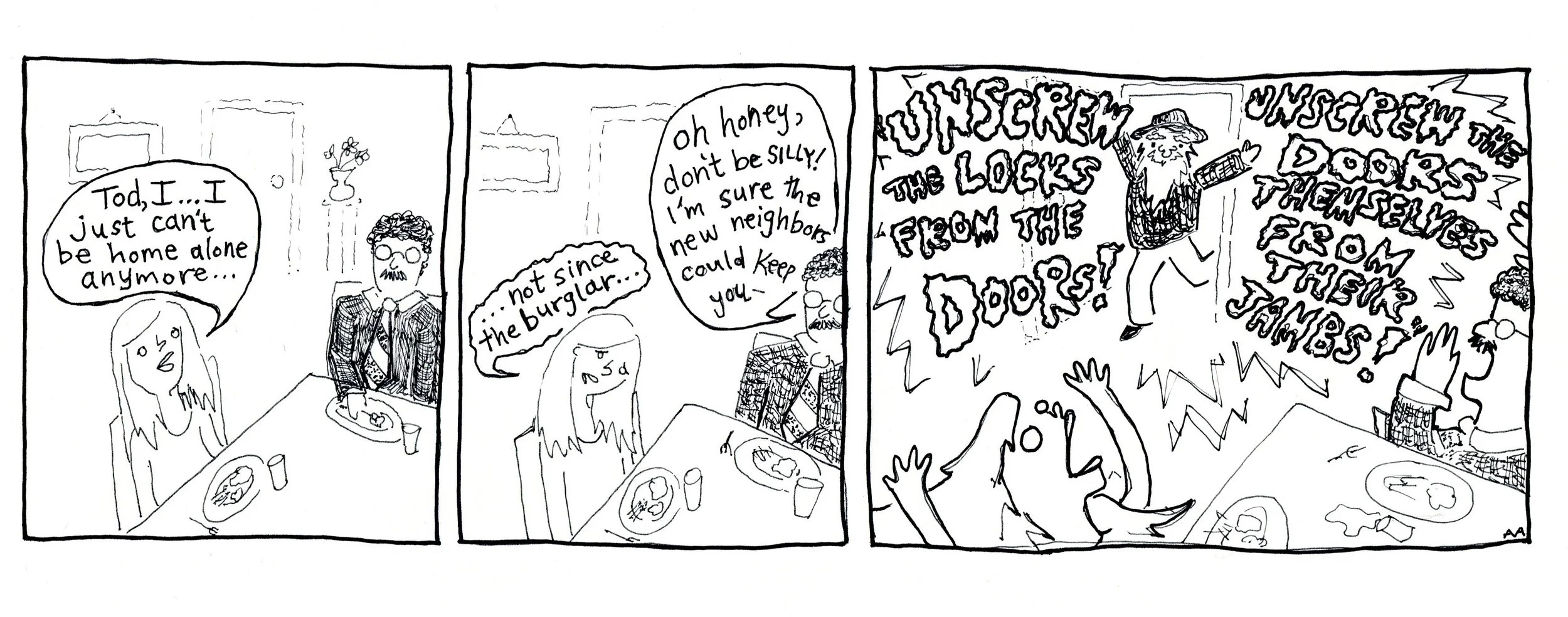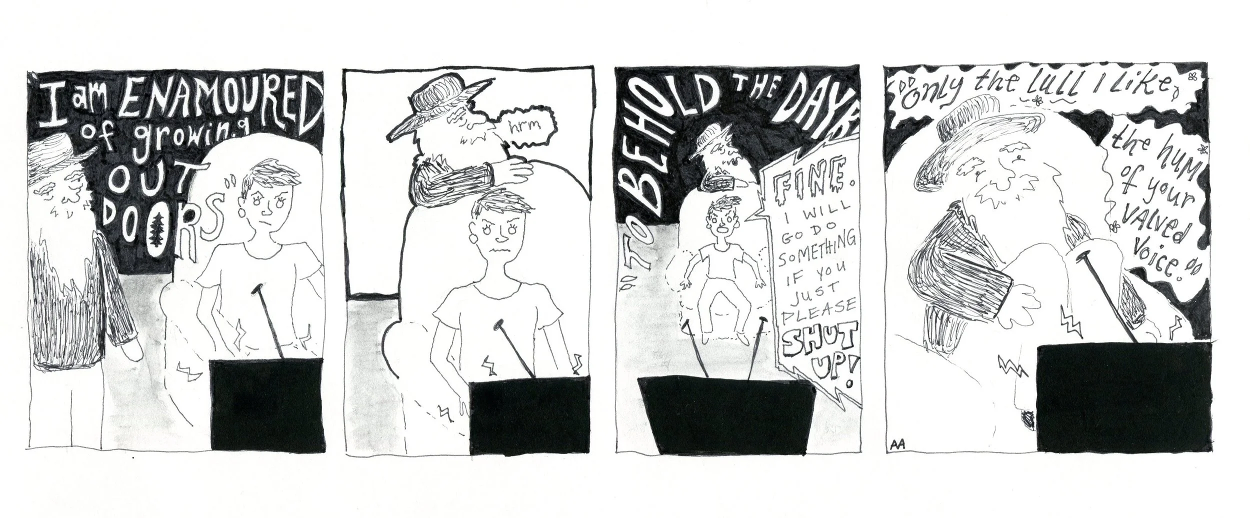 We practiced a variety of exercises and styles. If I remember correctly, the final project was a series of strips and four full pages about characters we had developed over the course.